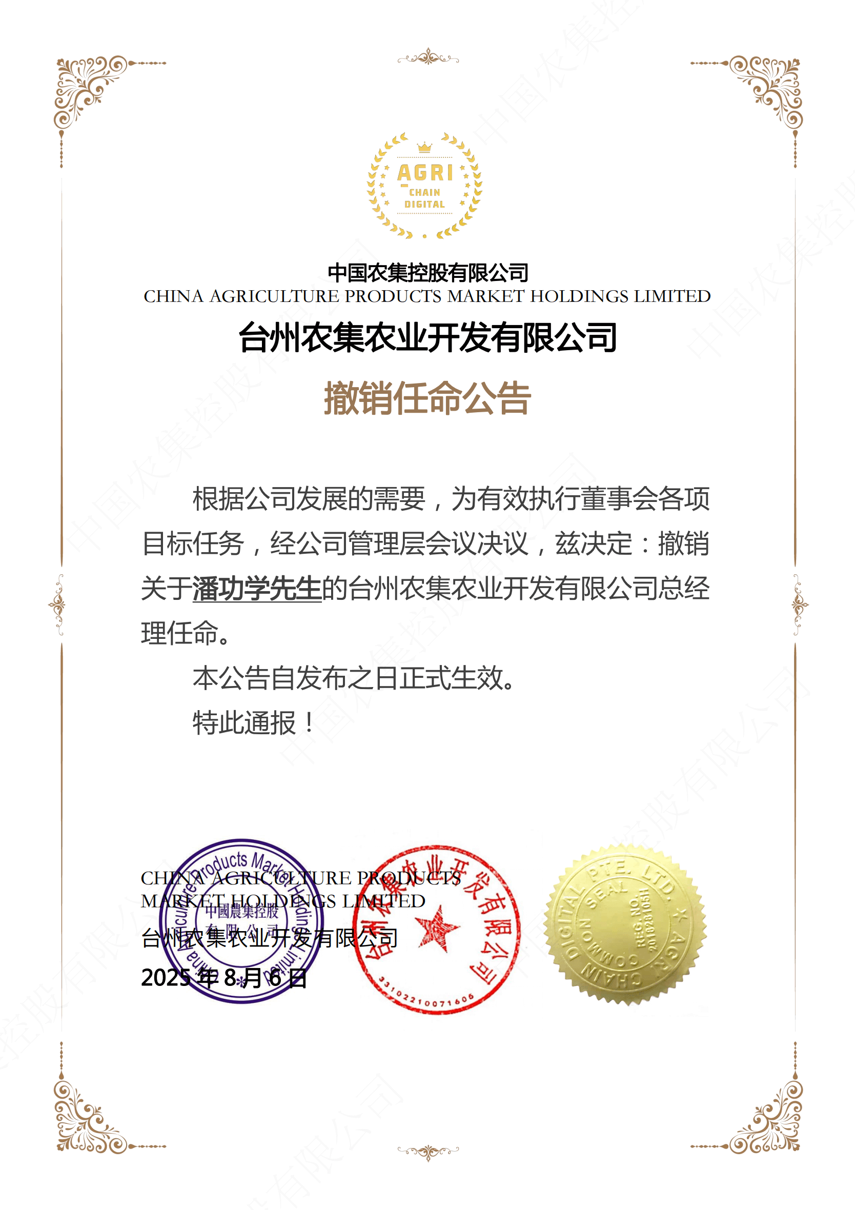 关于撤销台州农集农业开发有限公司总经理任命的公告